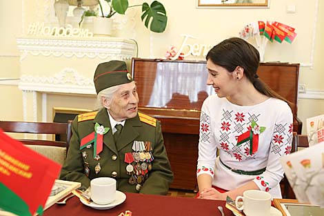Диалог поколений прошел в теплой атмосфере за чашкой чая. Ветераны поделились воспоминаниями о том, как защищали и освобождали Беларусь от фашистских захватчиков, завоевывали Великую Победу. Атмосферу особой душевности встречи создало совместное исполнение популярных военных песен под баян. Не обошлось и без традиционных подарков: участницы популярного студенческого проекта подарили ветеранам сладкие подарки с брендом проекта "Цветы Великой Победы".