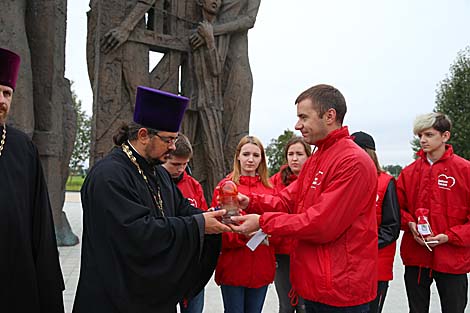В свою очередь волонтеры БРСМ передали в Храм-памятник в честь Всех Святых землю из Александровского сквера, кладбища "Военное", мемориального комплекса "Зыслов" Любаньского района, деревни Скирмантово Дзержинского района, переправы у деревни Зембин Борисовского района. Земля была привезена в холщовых мешочках и во время митинга засыпана в капсулу.