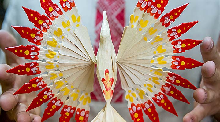 С давних времён в Берёзовском крае было принято вырезать из осины, ольхи или липы щепную птицу-оберег. Она, как верили местные жители, обладала чудодейственной силой – была хранительницей детей и символом семейного счастья, защищала дом от бед и ненастий. Как правило, вешали птицу в доме, а после Рождества сжигали в печи или уже летом бросали в купальский костёр. Считалось, что огонь способен уничтожить всё плохое, что собрано ею в доме. В древности крылатый оберег изготавливали только летом, когда дерево "живое" и идёт сокодвижение. В наше время обереги продолжают вырезать и зимой: но чтобы дерево ожило, мастера опускают его в тёплую воду. Сегодня уникальной технологией владеют считанные умельцы. И это не только скрупулёзная и тонкая, но и очень душевная работа. Из одного бруска мастер вырезает туловище и голову, из другого – расщепив дерево на тонкие пластинки-перья – создает крылья и хвост. Всё для того, чтобы получилась красивая птица, которая на протяжении отведенной ей "жизни" будет радовать и оберегать семью.